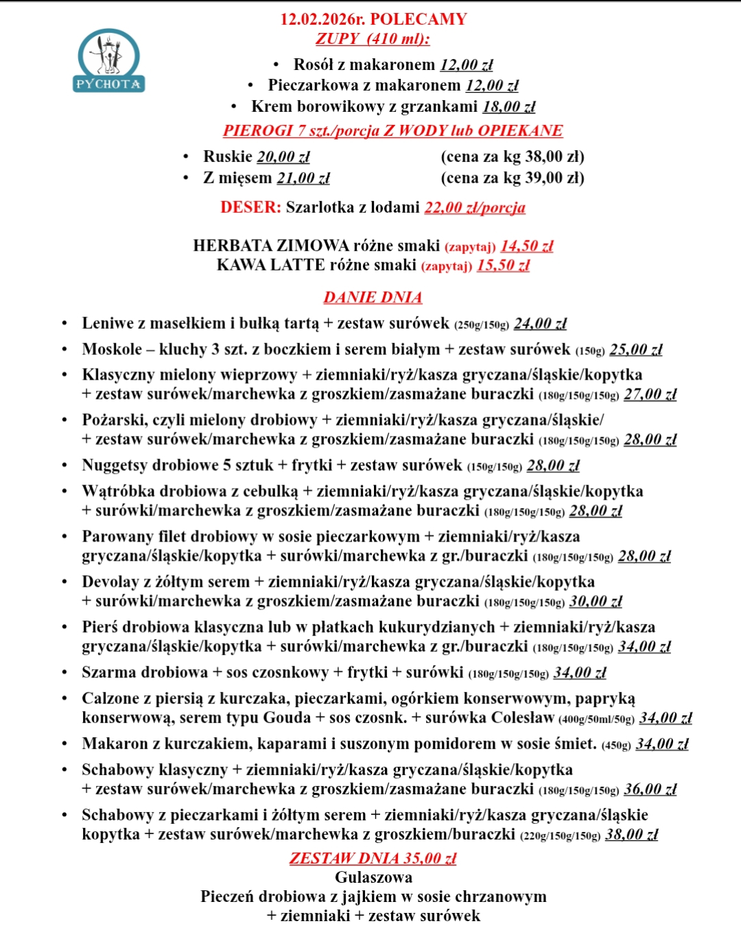 Lokal Pychota w Łęcznej to miejsce, które wyróżnia się bogatym i zróżnicowanym menu, oferującym różnorodność dań obiadowych, pizzę, sałatki oraz dania z kategorii fast food. Z pewnością jest to miejsce, które przyciąga zarówno lokalną społeczność, jak i przyjezdnych, oferując smaczne i zróżnicowane posiłki na każdą okazję.